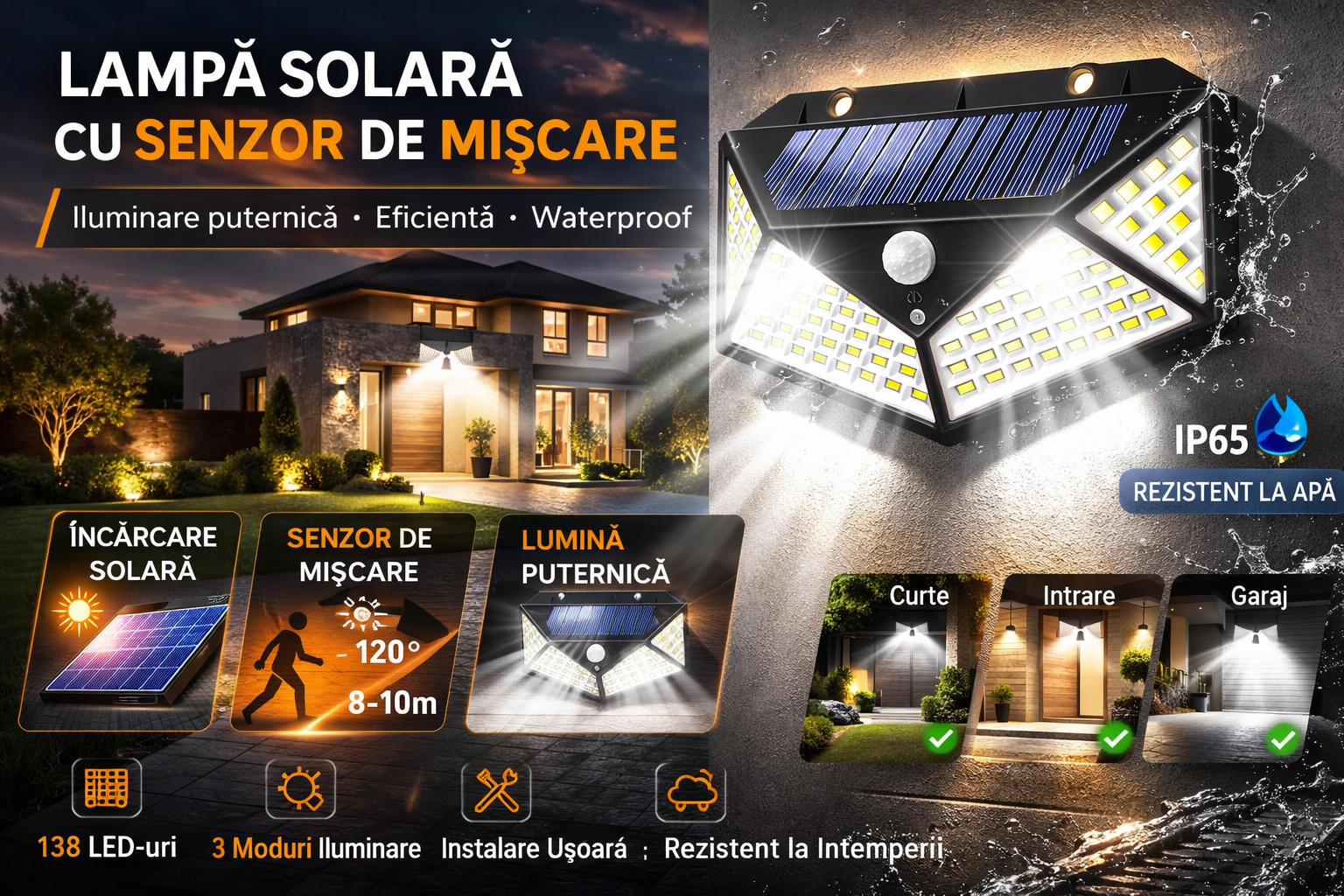 ✔ Carcasă rezistentă la apă (IP65), ideală pentru orice condiții meteo;