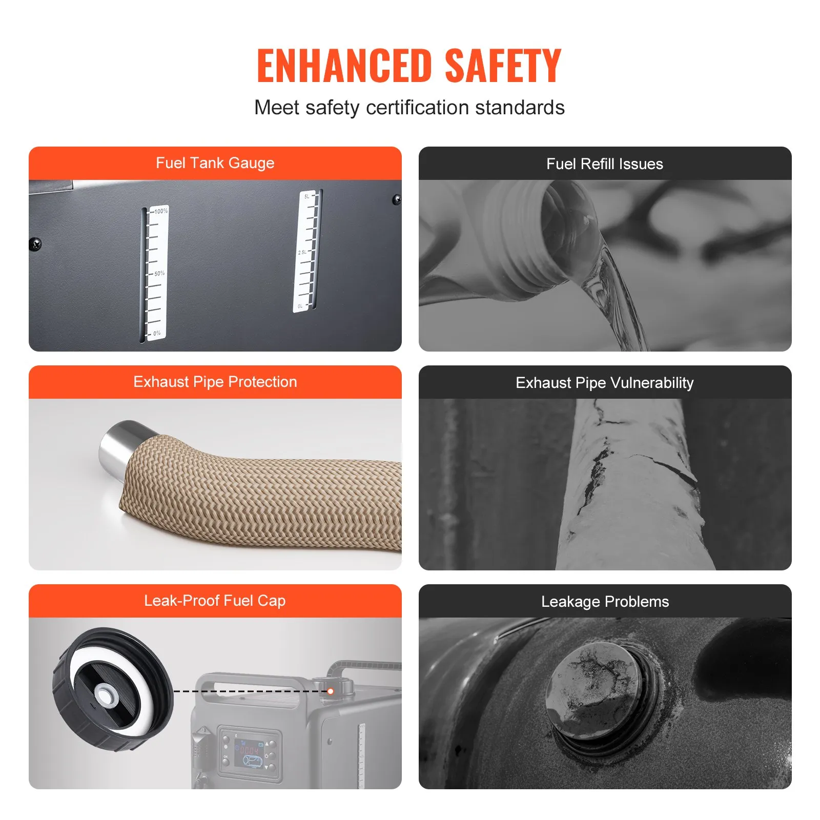 Sistem inovator de alarmă CO: Încălzitorul nostru diesel oferă siguranță sporită, cu o alarmă de CO încorporată care monitorizează continuu nivelurile de CO, oferind alerte sau oprire automată atunci când este necesar. Printre îmbunătățirile suplimentare se numără un capac etanș al rezervorului de combustibil, un indicator al nivelului de combustibil și protecție la supraîncălzire - asigurând liniștea sufletească în timpul utilizării prelungite.